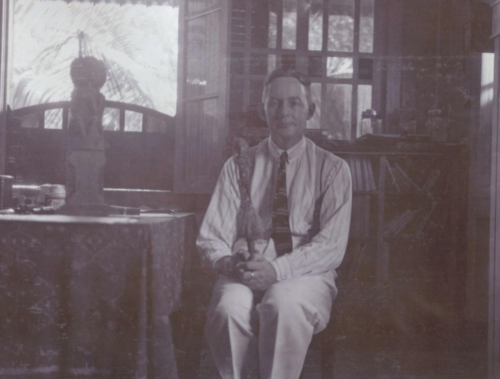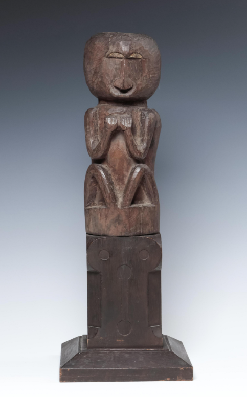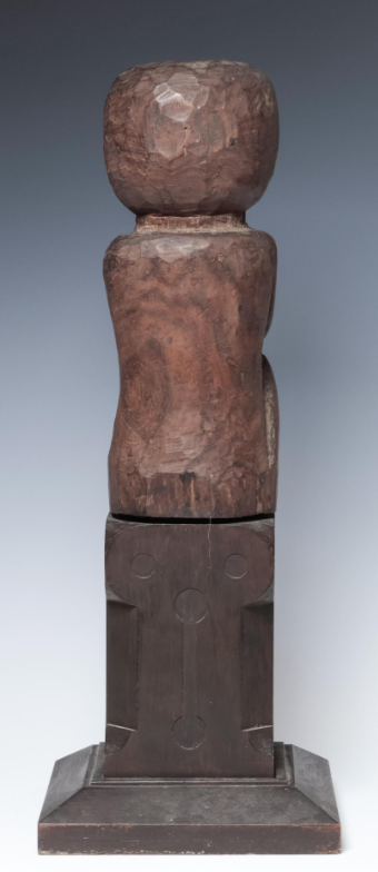 Below the statue and sunk in the sockle is a peg to insert the figure on top of the tafu, altar. The stand was executed by Bertling himself and shows the tatse of the time. The photograph was taken in Northeast Sulawesi, ca 1928.