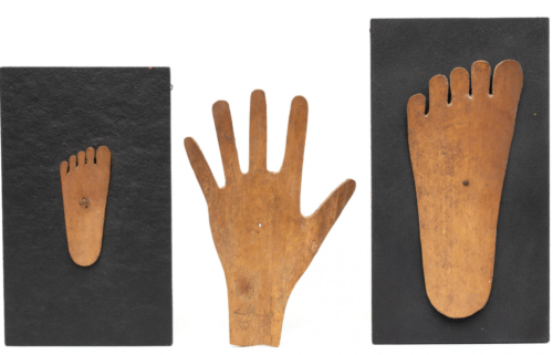 Stencils for kirekat, commemorative signs; here a child’s foot and an adult hand and foot.