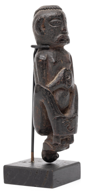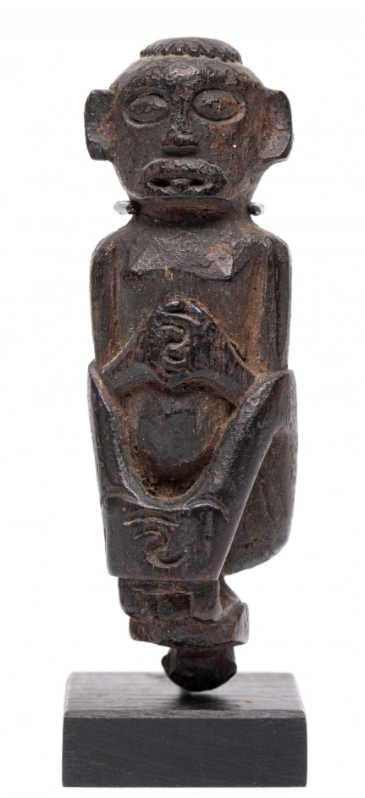 Intriguing amulet showing a (prbably) female figure with pronounced lips jutting tip of the tongue. Hands and feet are rendered as flat planes with incised tfingers and toes intersecting. Below her a diminutive figure in a crouchinh position.