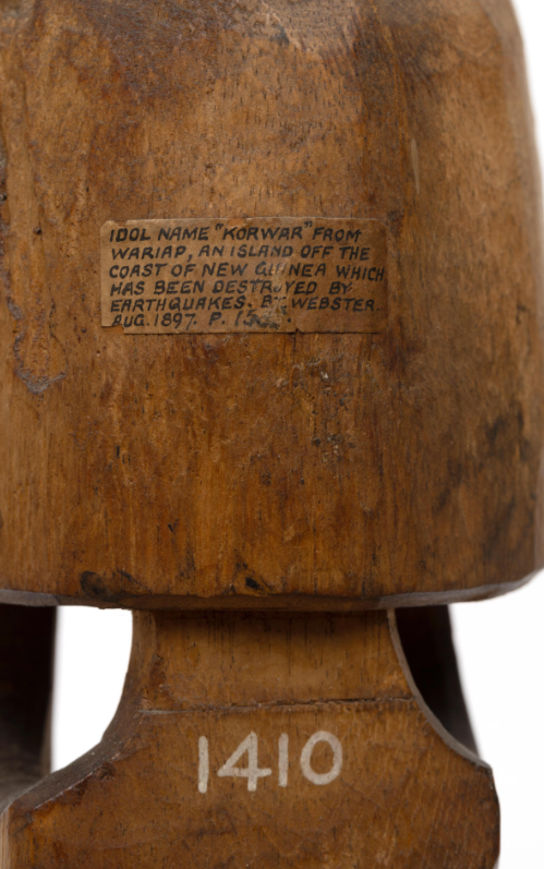 One of the three korwars Pleyte, former curator of Artis Museum, Amsterdam, sold to Webster. They all were acquired as hailing from an island destroyed by earthquakes, Wariab. In interesting not is that all three unlike their similar provenance, were carved in different styles.