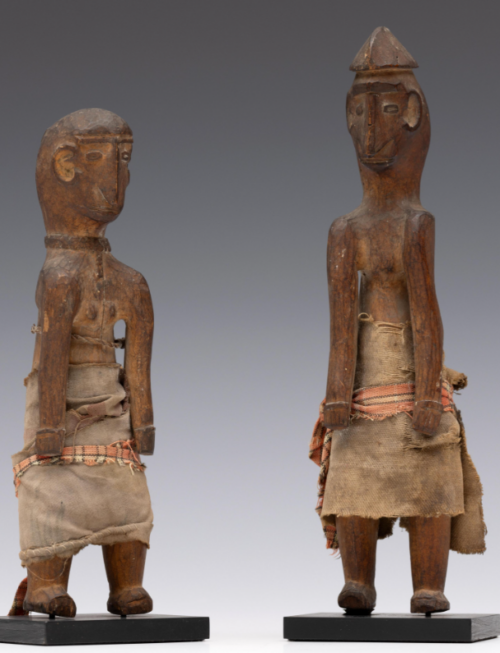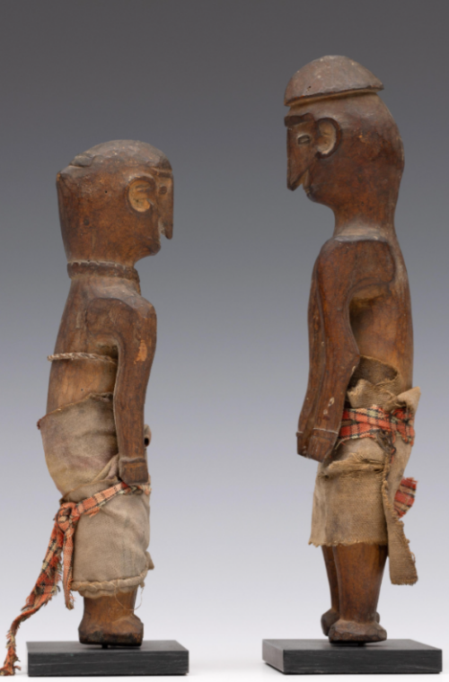 Exact function of these ancestor figures, carved as couples, is unknown. They were hung on a rack, ruma tara, in the house of a lineage chief.