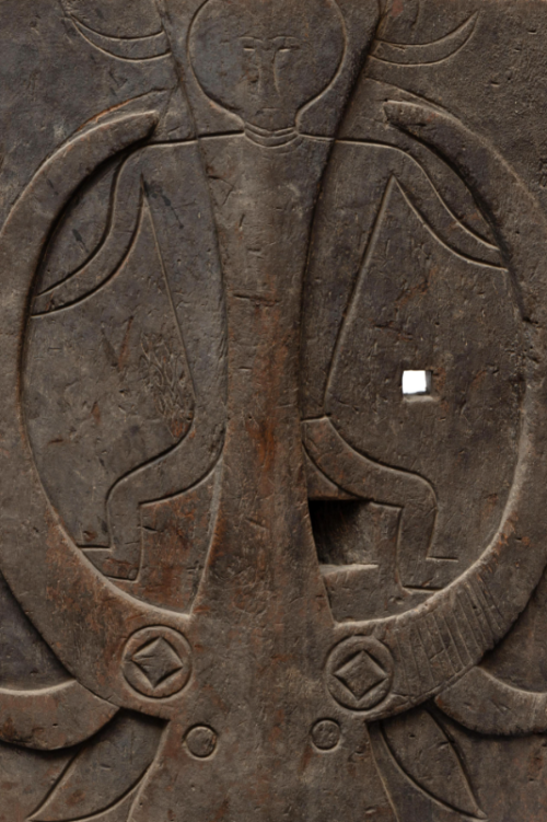 As as symbol of fecundity, wealth and power the water buffalo is omnipresent in Toraja culture. Not only is the kerbau the guardian of the dead, the animal is considered the vehicle of the dead tot the hereafter. On the present old item the stylised head with an upward extension – to some interpreted as the Tree-of-Life – we see a male figure with spreaded arms and legs in between the near circle of the horns connoting both death and fecundity in this very image. By rendering the figure in contours the spirit nature seems to be accentuated.