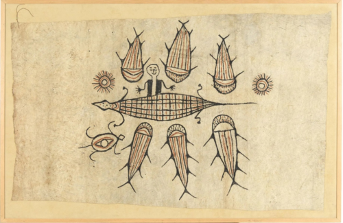 A rather schematic rendition with a prominent anthropomorphic figure in the centre enclosed by fish-like creatures, two quadrupeds, and two sun-motifs. An unknown universe without the swirls.